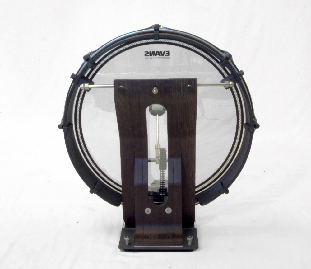 Kick drum, 18″ by 70 mm depth, equipped with S-hoops and Evans EC2S clear. Kick drum complete includes the Kick stand combo and can be mounted directly on the J-rig. The lugs unique design are free mounted without any screws and got its own flexibility to fit the tension rods/hoop/head. Kick drum 18″ complete fits many of the common/ordinary kick pedals on the market due to the bottom plate solution. The adjustable pressure screws secure the perfect application between the kick pedal and the stand, and its anchoring to the rig makes the kick feels as stabile as any other heavy and deeper kick drum. Note: the pedal shown is not included.